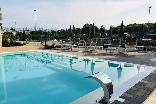 Very convenient location close to railway station and the bus for Gardaland and other parks if planned short stay to visit these. The shores of Lake Garda are 10 minutes walk away. Par ailleurs en tant que client vous êtes invité à profiter de la piscine et du petit déjeuner inclus offert par lEnjoy Garda Hotel.